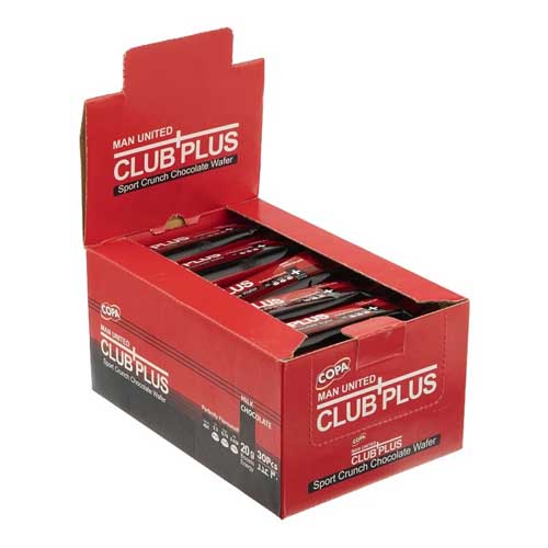 ویفر باشگاه منچستر کوپا کلاب پلاس، ترد و خوشمزه با طعم کاکائو بوده و با وزن 20 گرمی به صورت یک عددی و بسته 30 عددی عرضه داده شده است. دارای طرح باشگاههای اروپا بر روی بستهبندی بوده و جذاب و زیبا برای طرفداران فوتبالی میباشد.