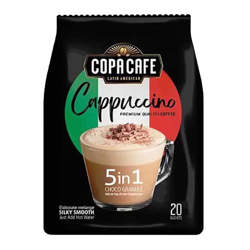 کاپوچینو 5 در 1 کوپا با وزن ساشه ای 25 گرم به صورت تک و بسته 20 عددی عرضه گردیده و حاوی ساشه شکلات که به بسته کاپوچینو چسبیده میباشد. این محصول با طعم فوق العاده خوشمزه و ملایم دارای فوم و خامه زیاد بوده و با افزودن 180 میلی لیتر آب داغ یا شیر داغ حاضر میباشد.
