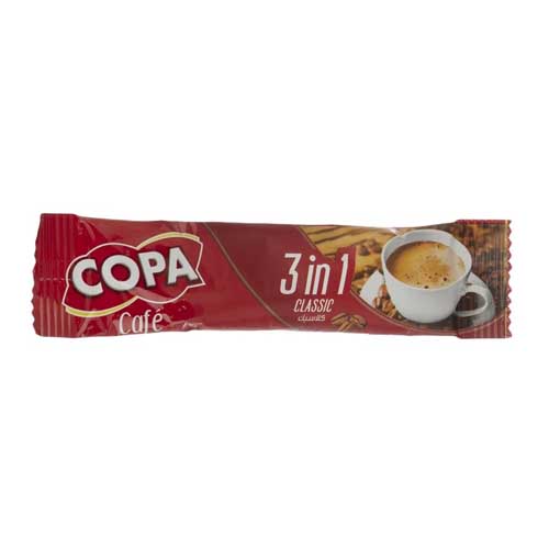 پودر کافی میکس کلاسیک 3 در 1 کوپا با وزن ساشه ای 18 گرم به صورت تک، بسته 20 عددی و بسته 40 عددی عرضه میگردد. این محصول حاوی آنتیاکسیدان، پلی فنول ها و مقادیر کمی از ویتامینهای B1 ،B2 ،B3 ،B5، پتاسیم، منگنز و پتاسیم میباشد.