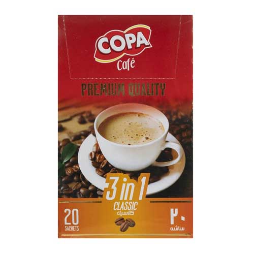 پودر کافی میکس کلاسیک 3 در 1 کوپا با وزن ساشه ای 18 گرم به صورت تک، بسته 20 عددی و بسته 40 عددی عرضه میگردد. این محصول حاوی آنتیاکسیدان، پلی فنول ها و مقادیر کمی از ویتامینهای B1 ،B2 ،B3 ،B5، پتاسیم، منگنز و پتاسیم میباشد.