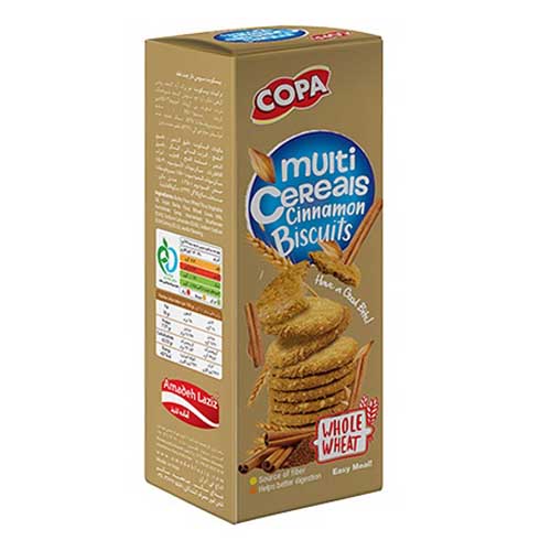بیسکویت چند غله کوپا، حاوی سبوی و فیبر طبیعی بوده که به هضم راحتتر آن کمک میکند و از بیماریهای گوارشی نیز جلوگیری میکند. دارای وزن 150 گرم و در طعمهای ساده، قهوه، دارچین و زنجبیل عرضه میگردد.