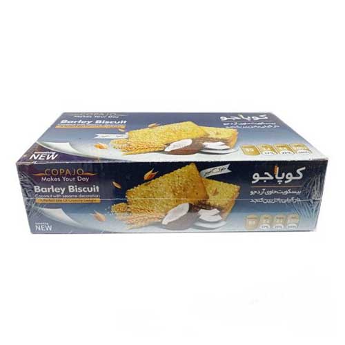 بیسکویت جو کوپا با طعم نارگیل و تزئین کنجد، در دو وزن 500 و 900 گرمی ارائه شده است. سبوس دار، خوشمزه و مقوی بوده و مناسب برای مصرف میانوعده، عصرانه و یا پذیرایی در مهمانیها میباشد.