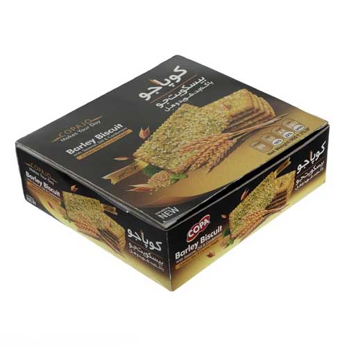 بیسکویت جو کوپا با طعم شوید و هل و تزئین کنجد، در دو وزن 500 و 900 گرمی عرضه میگردد. سبوس دار، مقوی، ترد و خوشمزه بوده و مناسب برای میانوعده کودکان و یا عصرانه و مهمانیها و .. میباشد.