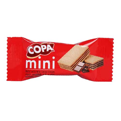 ویفر مینی با طعم کاکائویی شیری کوپا، دارای طعم دلپذیر و خوشمزه شیر و شکلات بوده و مناسب برای یک میانوعده سبک برای کودکان، یا خوراکی مدرسه آنها و یا عصرانه برای بزرگسالان میباشد و به صورت یک عددی و بسته 425 گرمی عرضه میشود.