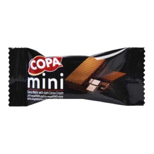 ویفر کاکائویی مینی با طعم کاکائویی تلخ کوپا، دارای طعم دلپذیر و خوشمزه شکلات تلخ بوده و مناسب برای یک میانوعده خوشمزه و لذیذ برای سنین مختلف میباشد و به صورت یک عددی و بسته 425 گرمی عرضه میشود.