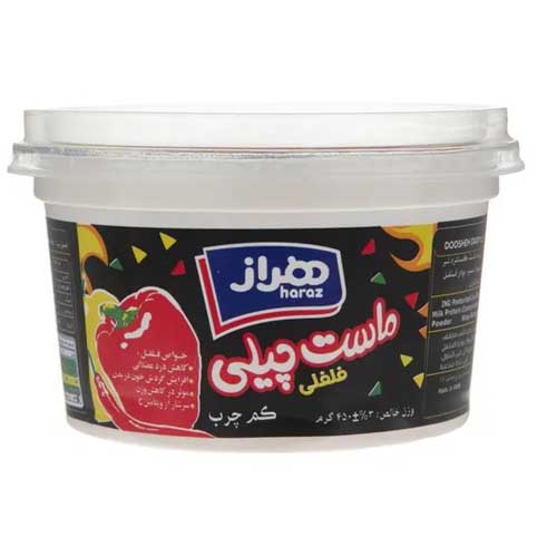ماست چیلی کم چرب هراز از ترکیب ماست، فلفل دلمهای، فلفل چیلی و گوجه فرنگی تهیه میشود و دارای طعم تند بینظیری است. فلفل چیلی سرشار از ویتامین C بوده و دارای خواص دارویی بیشمار و مفید برای سلامتی نیز میباشد.