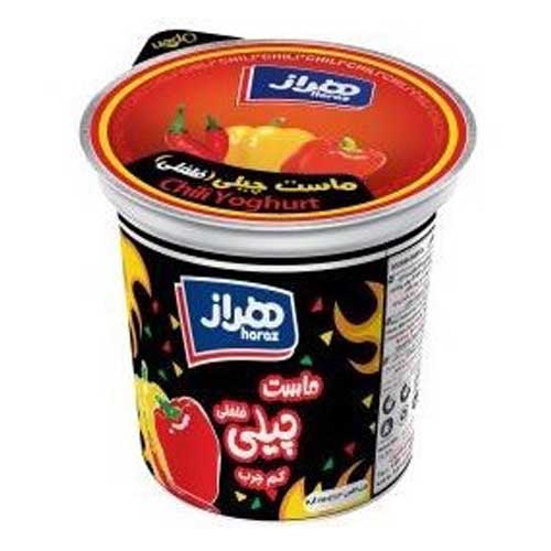 ماست چیلی کم چرب هراز از ترکیب ماست، فلفل دلمهای، فلفل چیلی و گوجه فرنگی تهیه میشود و دارای طعم تند بینظیری است. فلفل چیلی سرشار از ویتامین C بوده و دارای خواص دارویی بیشمار و مفید برای سلامتی نیز میباشد.