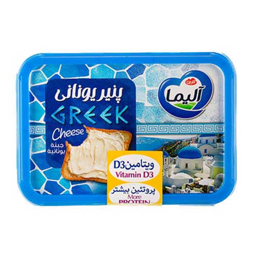 پنیر یونانی آلیما در دو وزن 150 گرم و 300 گرم از پنیر خامه ای، ماست چکیده، پودر پروتئین، آب پنیر، نمک تصفیه شده خوراکی، پایدار کننده و ویتامین D3 تهیه شده و ضد حساسیت میباشد. این محصول پنیری نیمه چرب حاوی پروتئین وی بوده و مناسب برای ورزشکاران میباشد.