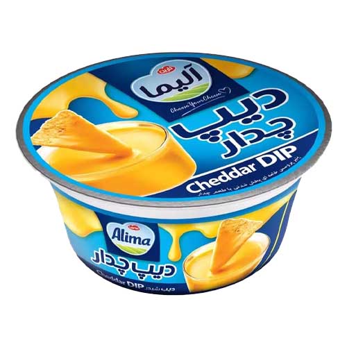 پنیر دیپ چدار آلیما در دو وزن 120 گرم و 750 گرم از پنیر خامه ای، پودر پروتئین تغلیظ شده شیر، کره پاستوریزه حیوانی، نمک های امولسیفایر، نمک تصفیه شده خوراکی و طعم دهنده چدار تهیه شده و یک پنیر پرچرب با بافت نرم و لطیف جهت غوطه ور کردن غذاهایی مانند چیپس، میوه و سبزیجات درون آن میباشد.