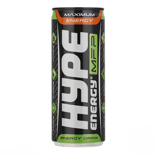 نوشابه انرژی زا هایپ مدل MFP با وزن 250 میلی لیتر حاوی کافئین، تانورین و ویتامینهای B است که باعث افزایش انرژی و هوشیاری، کاهش استرس و آسیب های ماهیچه ای و .. میشود و به صورت 1، 6 و 24 عددی عرضه میگردد.