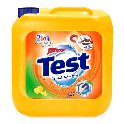مایع سفید کننده تست از بین برنده قوی لکهو سفید کننده و درخشان کننده البسه، سطوح مختلف آشپرخانه و حمام میباشد. دارای تکنولوژی آهنربا برای جذب آلودگیهای است و البسه را تمیز و ضدعفونی میکند.