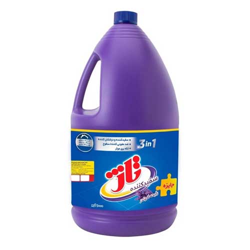 مایع سفید کننده 3 در 1 تاژ با رایحه لاوندر با دو حجم 1 و 4 لیتر تاژ عرضه میگردد. این محصول مناسب برای تمیز، ضد عفونی کردن، سفید کردن سطوح شیب دار، سرویس بهداشتی، توالت فرنگی، سینک ظرفشویی و دستشویی، دیوار، کف زمین و البسه سفید مناسب است.