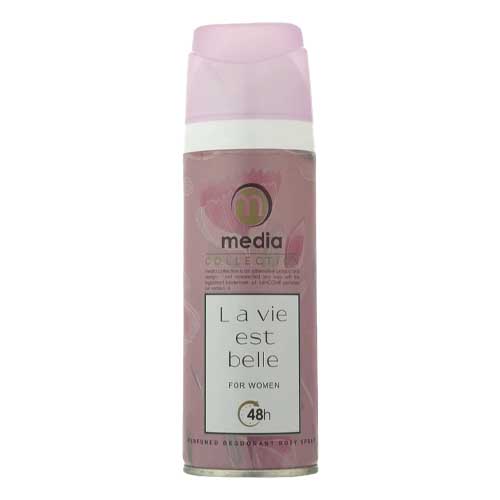 اسپری خوشبو کننده بدن زنانه مدیا با رایحه عطرهای معروف لالیک لامور با رایحه ملایم، لاویست بله و لاگوست با رایحه خنک و معتدل، چنسی چنل با رایحه خنک و باکارات رژ با رایحه چوبی، شیرین و ملایم و حجم 200 میلیلیتر عرضه گردیده. این خوشبو کننده بدن به دلیل تنوع در رایحه، قابل استفاده روزانه در تمام فصول سال میباشد.