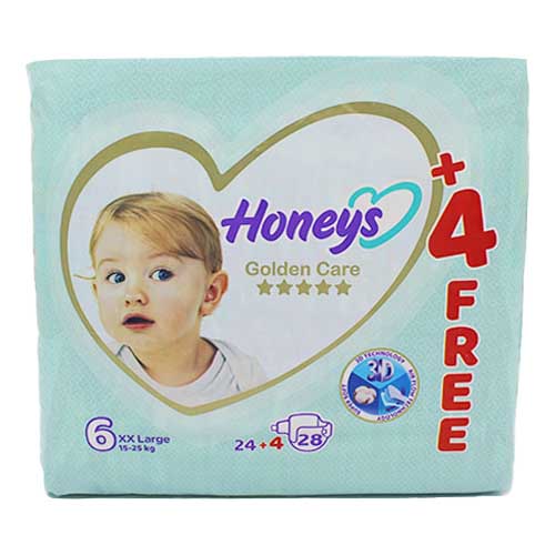 پوشک بچه چسبی هانیز سایز 6 خیلی خیلی بزرگ مناسب وزن 15 تا 25 کیلوگرم در دو بسته 24 و 28 عددی عرضه شده است. این پوشک کودک با استفاده از تکنولوژی Dry Lock مایعات را به سرعت و به طور کامل جذب و از نشتی جلوگیری میکند.
