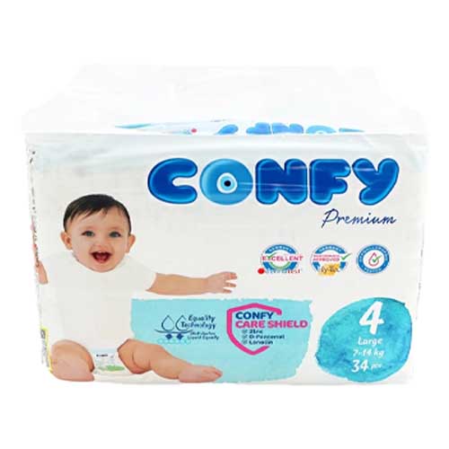 پوشک بچه چسبی Premium کانفی در سایز 4 مناسب وزن 7 تا 14 کیلوگرم در بسته 34 عددی و سایز 6 خیلی بزرگ مناسب وزن 15 تا 25 کیلوگرم در بسته 24 عددی عرضه شده است. ساختار آناتومیک این پوشک کاملا با بدن نوزاد سازگار و به کودک اجازه حرکت آزادانه میدهد.