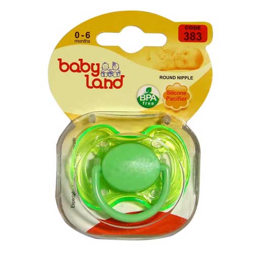 پستانک ارتودنسی بیبی لند کد 383 با سری سیلیکونی نرم و ارتودنسی به رشد دندان و فک نوزاد کمک میکند. این محصول دارای حفرههای هواساز بر روی بدنه پستانک است.