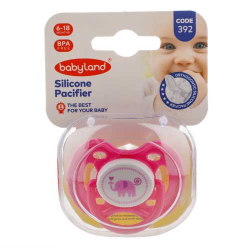 پستانک ارتودنسی بیبی لند کد 392 دارای سری سیلیکونی نرم و ارتودنسی است که سازگار با رشد دندان و فک نوزاد است. دارای حفرههای هواساز بر روی بدنه پستانک بوده که از تعریق نوزاد جلوگیری میکند..