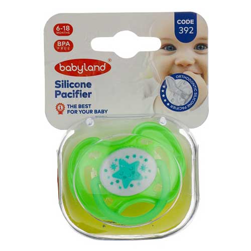 پستانک ارتودنسی بیبی لند کد 392 دارای سری سیلیکونی نرم و ارتودنسی است که سازگار با رشد دندان و فک نوزاد است. دارای حفرههای هواساز بر روی بدنه پستانک بوده که از تعریق نوزاد جلوگیری میکند..