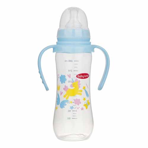 شیشه شیر کلاسیک بیبی لند کد 248 با حجم 240 میلیلیتر، با جنس بدنه پروپیلن و سری سیلیکونی فاقد مواد مضر میباشد. این محصول با طراحی آرگونامیک و دسته بر روی بدنه جهت سهولت استفاده کودک عرضه گردیده.