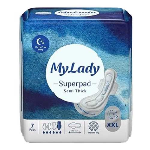 سوپر پد خیلی خیلی بزرگ مای لیدی در دو مدل مشبک همیشه خشک و کتان به نرمی ابریشم در بستهبندی 7 عددی عرضه شده است. این نوار بهداشتی با پشت 50 درصد پهنتر، بدون نشتی و خنثیکنندهی بو با قدرت جذب خیلی خیلی زیاد عرضه شده است.