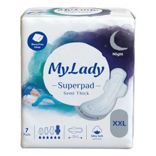 سوپر پد خیلی خیلی بزرگ مای لیدی در دو مدل مشبک همیشه خشک و کتان به نرمی ابریشم در بستهبندی 7 عددی عرضه شده است. این نوار بهداشتی با پشت 50 درصد پهنتر، بدون نشتی و خنثیکنندهی بو با قدرت جذب خیلی خیلی زیاد عرضه شده است.