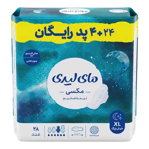 نوار بهداشتی مکسی نیمه ضخیم مای لیدی در دو سایز لارج کتان به نرمی پنبه و ایکس لارج مشبک، در بستهبندی 28 عددی عرضه گردیده. این پد با چسب زیری استاندارد و قدرت جذب خیلی زیاد و کانالهای محافظ، ایمنی کامل را در طول روز و شب را برای شما تضمین میکند.