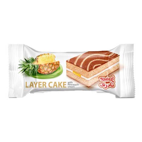 کیک دو لایه نادری با طعم پرتقالی، موزی و آناناس در بسته 30 گرمی عرضه شده است. این کیک از ترکیب کیک اسفنجی و لایه داخلی کرم با طعم میوه بسیار نرم، لطیف و خوشمزه بوده و مناسب به عنوان یک میان وعده، عصرانه و.. میباشد.