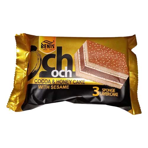 کیک سه لایه اوچ بنیس در دو طعم شکلاتی و وانیل کاکائو باطعم عسل و تزئین کنجد یکی از کیکهای سه لایه بسیار خوشطعم و خوشمزه برند بنیس میباشد. میتوان از این کیک به عنوان میان وعدهای لذیذ، شیک و مناسب در مراسم، رویدادها و مناسبتهای گوناگون استفاده کرد.