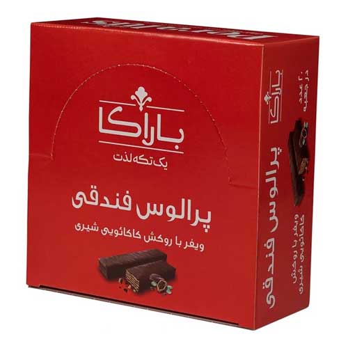 ویفر پرالوس باراکا با روکش شکلات تلخ و کاکائویی فندقی و به صورت 20 عدد مینی ویفر 35 گرمی در یک جعبه عرضه گردیده است. این ویفر با ترکیب ویفر و کاکائو دارای طعم بسیار دلپذیر ی بوده و مناسب میانوعده و یا پذیرایی همراه با چای و نوشیدنی های دیگر میباشد.
