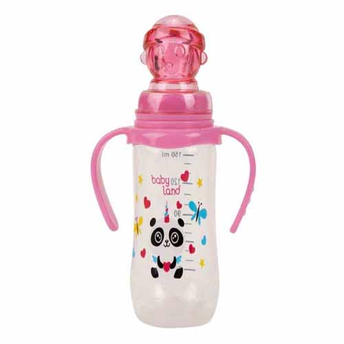 شیشه شیر عروسکی 240 میلی لیتری بیبی لند با طراحی آرگونامیک و دو دستگیره در طرفین استفاده از آن را برای کودک آسان نموده. جنس این محصول از پلیپروپیلن و فاقد مواد مضر با عملکرد ضد نفخ میباشد.