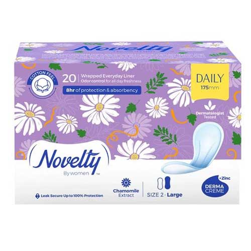 نوار بهداشتی روزانه ناولتی، دارای دو سایز متوسط و بزرگ و بسته بندی 20 عددی بوده و مناسب برای استفاده روزانه است. پوشش پنبه ای ضد حساسیت این محصول برای جذب بالاتر دارد و حاوی زینک اکساید و عصاره گل بابونه نیز میباشد.