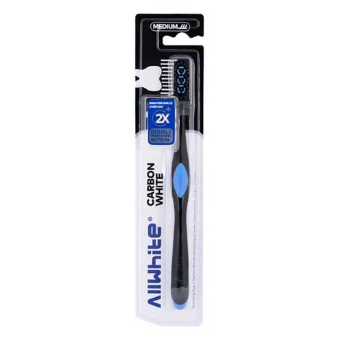 مسواک مدیوم allwhite مدل carbon white حاوی ذرات کربن فعال برای سفیدکنندگی بیشتر بوده و جرم و پلاک را از سطوح دندان پاک میکند. دارای دندانههای پلاستیکی جهت پولیش دندانها و پاککنندگی فاصله بین دندانی میباشد.