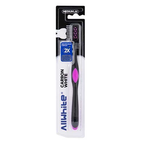 مسواک مدیوم allwhite مدل carbon white حاوی ذرات کربن فعال برای سفیدکنندگی بیشتر بوده و جرم و پلاک را از سطوح دندان پاک میکند. دارای دندانههای پلاستیکی جهت پولیش دندانها و پاککنندگی فاصله بین دندانی میباشد.