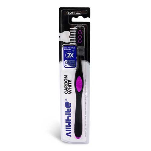 مسواک سافت allwhite مدل carbon white حاوی ذرات کربن فعال برای سفیدکنندگی بیشتر بوده و جرم و پلاک را از سطوح دندان پاک میکند. دارای دندانههای پلاستیکی جهت پولیش دندانها و پاککنندگی فاصله بین دندانی میباشد.