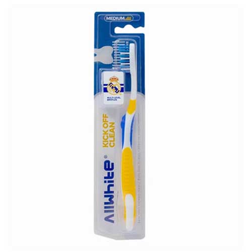 مسواک allwhite مدل kick of clean پاک کننده همه جرمها و پلاکها از سطح دندان است. دارای دسته ارگونومیک بوده که از فشار به لثهها جلوگیری می کند. طراحی بدنه مسواک به شکل تیمهای معروف جهانی میباشد.