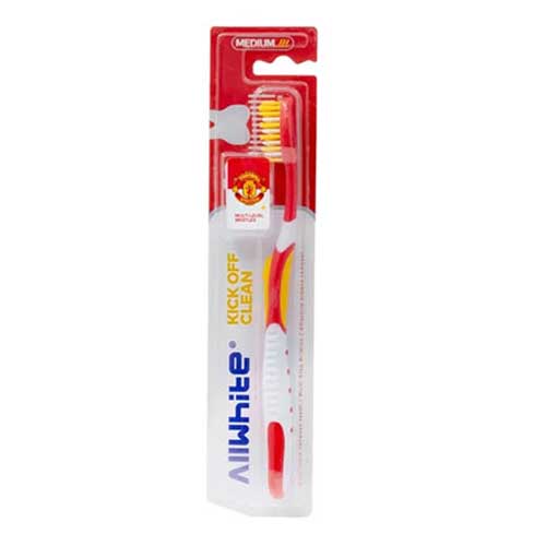 مسواک allwhite مدل kick of clean پاک کننده همه جرمها و پلاکها از سطح دندان است. دارای دسته ارگونومیک بوده که از فشار به لثهها جلوگیری می کند. طراحی بدنه مسواک به شکل تیمهای معروف جهانی میباشد.