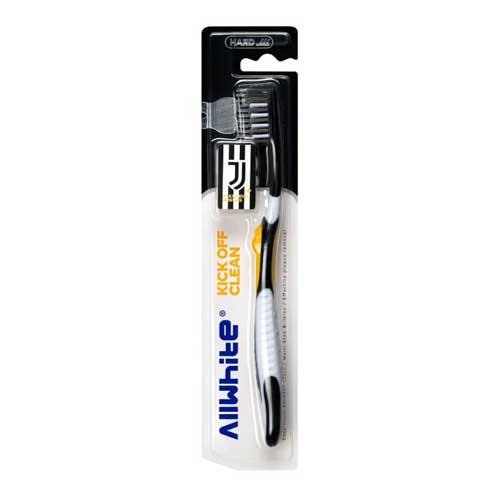 مسواک allwhite مدل kick of clean پاک کننده همه جرمها و پلاکها از سطح دندان است. دارای دسته ارگونومیک بوده که از فشار به لثهها جلوگیری می کند. طراحی بدنه مسواک به شکل تیمهای معروف جهانی میباشد.