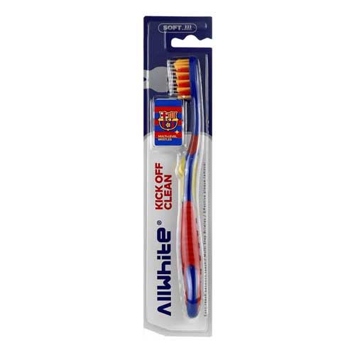 مسواک allwhite مدل kick of clean پاک کننده همه جرمها و پلاکها از سطح دندان است. دارای دسته ارگونومیک بوده که از فشار به لثهها جلوگیری می کند. طراحی بدنه مسواک به شکل تیمهای معروف جهانی میباشد.