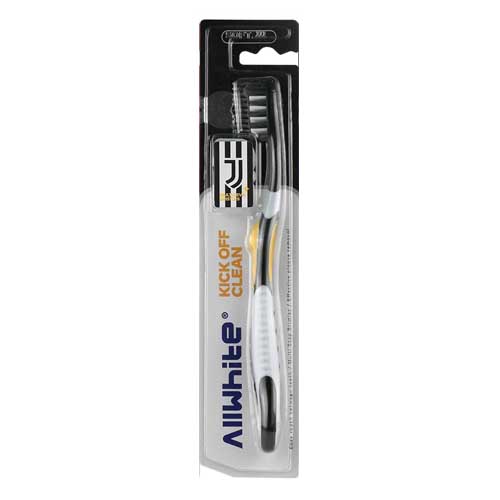 مسواک allwhite مدل kick of clean پاک کننده همه جرمها و پلاکها از سطح دندان است. دارای دسته ارگونومیک بوده که از فشار به لثهها جلوگیری می کند. طراحی بدنه مسواک به شکل تیمهای معروف جهانی میباشد.