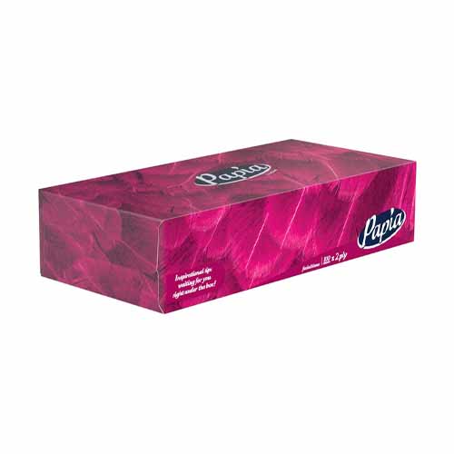 دستمال کاغذی جعبهای رومیزی پاپیا ۱۰۰ برگ و دولا، کاملا نرم و لطیف میباشد. این محصول با قدرت جذب بالا، در طرحهای متنوع جهت مصارف خانگی و و بهداشتی استفاده میشود.