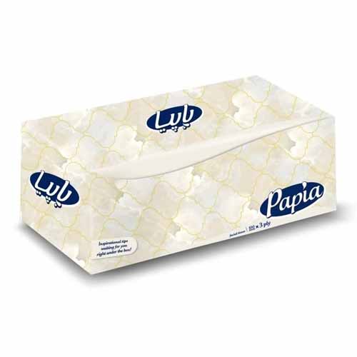 دستمال کاغذی جعبهای رومیزی پاپیا ۱۰۰ برگ و سه لا، کاملا نرم و لطیف میباشد. این محصول با قدرت جذب بالا، در طرحهای متنوع جهت مصارف خانگی و و بهداشتی استفاده میشود.