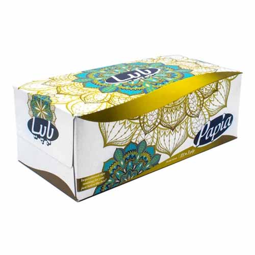 دستمال کاغذی جعبهای رومیزی پاپیا ۱۰۰ برگ و سه لا، کاملا نرم و لطیف میباشد. این محصول با قدرت جذب بالا، در طرحهای متنوع جهت مصارف خانگی و و بهداشتی استفاده میشود.