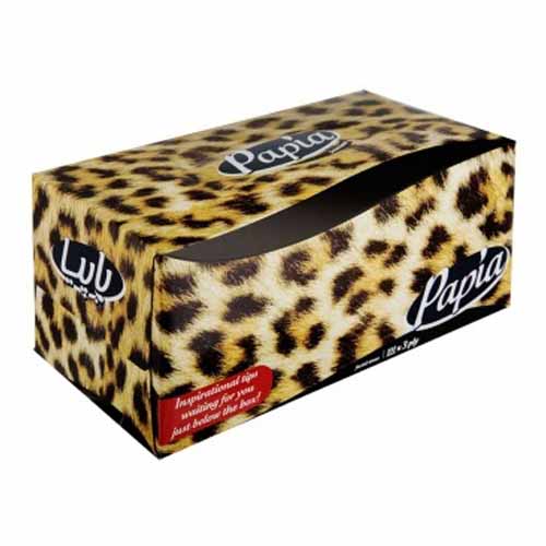 دستمال کاغذی جعبهای رومیزی پاپیا ۱۰۰ برگ و سه لا، کاملا نرم و لطیف میباشد. این محصول با قدرت جذب بالا، در طرحهای متنوع جهت مصارف خانگی و و بهداشتی استفاده میشود.
