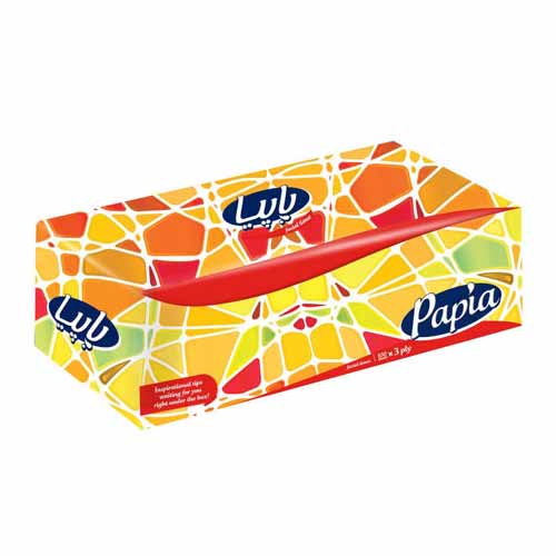 دستمال کاغذی جعبهای رومیزی پاپیا ۱۰۰ برگ و سه لا، کاملا نرم و لطیف میباشد. این محصول با قدرت جذب بالا، در طرحهای متنوع جهت مصارف خانگی و و بهداشتی استفاده میشود.
