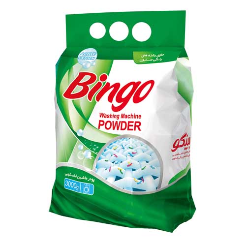 پودر ماشینی بینگو حاوی رشتههای رنگی صابون و اکسیژن فعال و دارای قدرت پاککنندگی و لکه بری بالا میباشد. قابلیت حلالیت بالا در در هر دمایی را دارد و محافظ رنگ و الیاف لباس است.