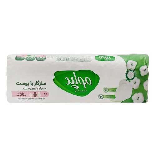 نوار بهداشتی کلاسیک مولپد، حاوی عصاره طبیعی پنبه، سازگار با پوست و ضد حساسیت است. دارای تکنولوژی HDC جهت نرمی، نازکتر شدن و جلوگیری از نشتی است. سایزهای بزرگ آن 9 عددی و سایز متوسط آن 10 عددی میباشد.