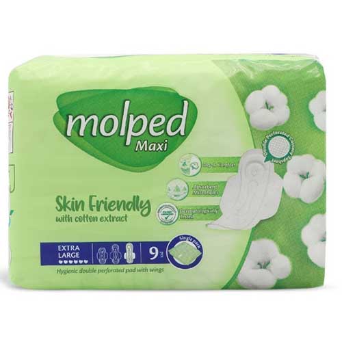 نوار بهداشتی اکسترا مولپد با بسته بندی تکی، دارای سطح رویه مشبک به نرمی پنبه است. حاوی عصاره طبیعی پنبه، سازگار با پوست و ضد حساسیت است. سایزهای بزرگ آن 9 عددی و سایز متوسط آن 10 عددی میباشد.
