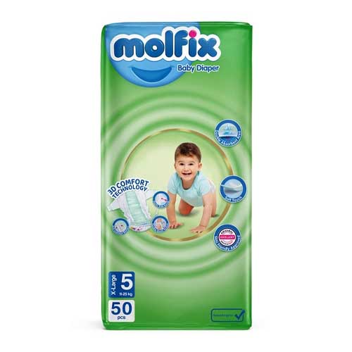 پوشک بچه مولفیکس سایز ۵ مناسب برای کودکان با وزن های ۱۱ تا ۲۵ کیلوگرم می باشد. این محصول دارای قابلیت جذب فوق العاده، نوارهای پهلو با خاصیت کشسانی عالی، ساختار آناتومیک، سازگار با پوست و فاقد لاتکس، پارابن و BPA میباشد.