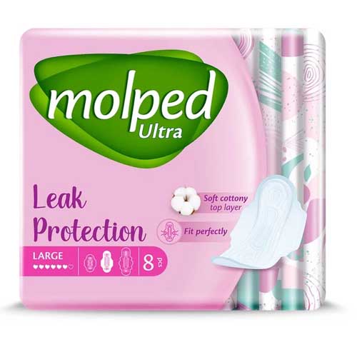 نوار بهداشتی اولترا مولپد ضخامت خیلی کم و جذب بسیار بالایی دارد. از برگشت رطوبت و خیسی جلوگیری و به دلیل وجود منافذ عبور دهنده هوا، مانع از بوی بد میشود. سایز خیلی بزرگ 7 عددی، بزرگ 8 عددی و متوسط 10 عددی میباشد.