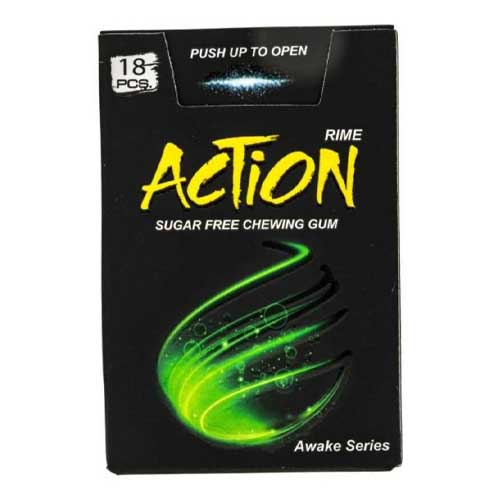 آدامس بدون شکر اکشن 18 عددی در دو طعم نعنا و اکالیپتوس خنک در بسته بندی پاکتی عرضه گردیده. آدامس های اکشن در طعم های بی نظیر و دارا بودن کافئین یک راه حل کوتاه، بیخطر و اثربخش برای مقابله با خوابآلودگیهای بی موقع میباشد.